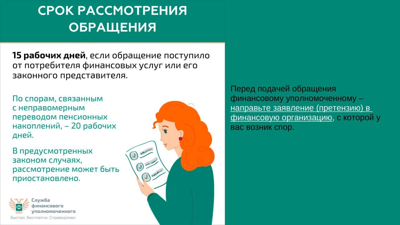 Ваши обращения финансовый уполномоченный рассматривает 15 рабочих дней (по спорам, связанным с неправомерным переводом пенсионных накоплений, – 20 рабочих дней) – без вашего визита. Никуда не нужно ходить.